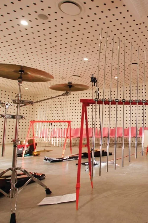 Vibrissa – Each instrument consists of twelve vertically mounted aluminium rods that are longitudinally stroked with gloved hands to produce ethereal “singing” tones. The long sustaining nature of the rods sound and microtonal tunings allow players a sonic palette of complex textures and harmonic complexity.